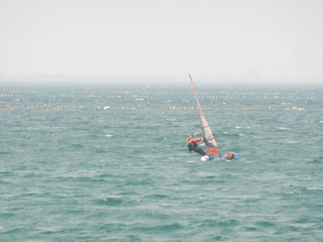 Big sailing day. Strong headwind always with a hint of offshore. Very present in my mind is a day of sailing in Fornells Bay in strong offshore wind when my mast snapped, and though I derigged and tried to paddle to reach shore, my efforts were futile. Also in mind is that wind blast from last night. Some fishing nets to negotiate. When the breeze ratchets up, I take the longer but safer inshore route to negotiate them. City shoreline. Ports built on estuaries so some parts have quite strong outgoing current. Zigzags for 15 nm, and close-hauled for the final 5 nm. Pleased with that. Very pleasant camping location, but at 1 AM a fierce wind arrives. Fortunately board, sail and drysuit are tied to a tree, otherwise they would have been blown into the water and lost. Gear is repeatedly flipped by the gusts. Tether is taut. Not a relaxing night.